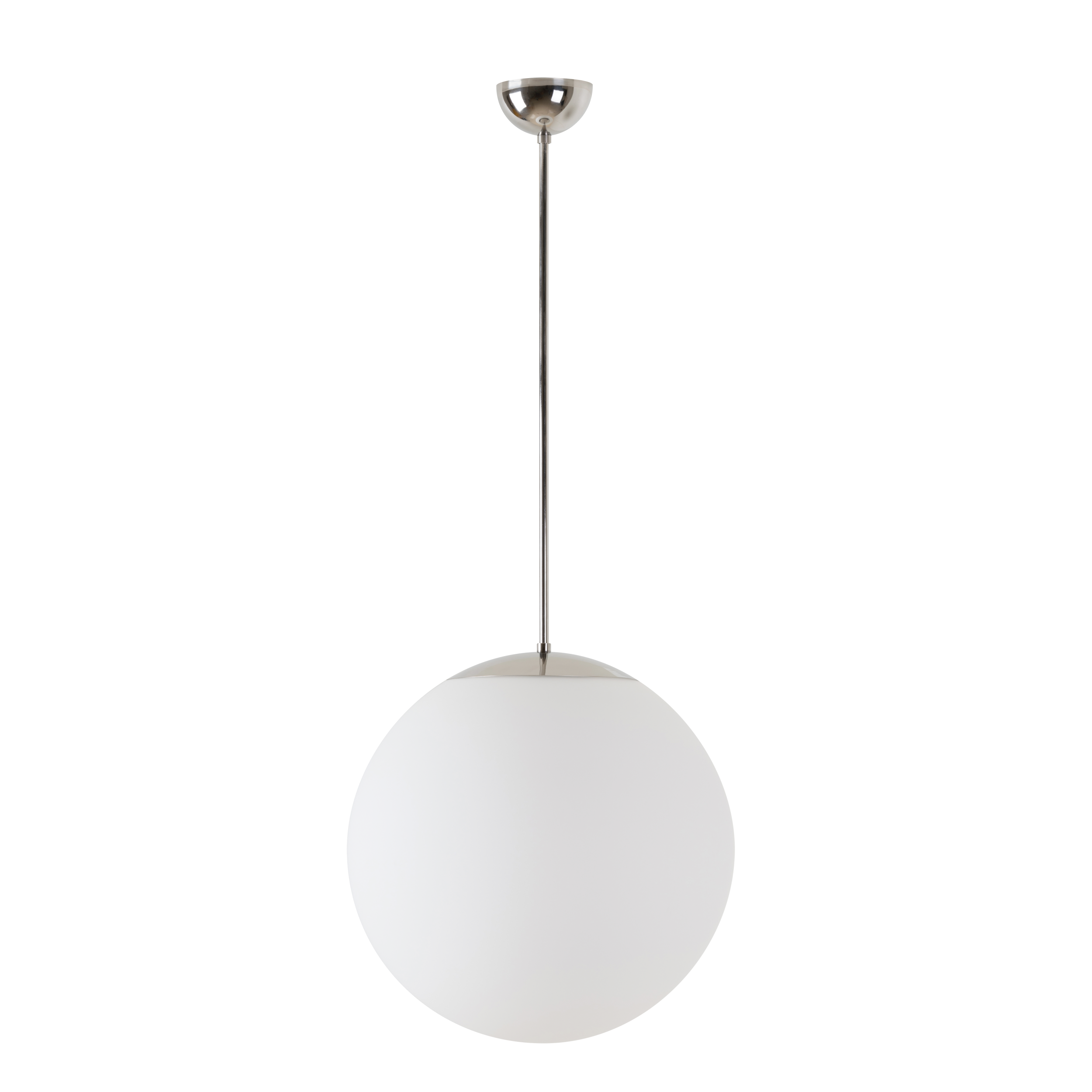 Nerez leštěné závěsné LED svítidlo ON/OFF a skleněné stínidlo TRIPLEX OPAL. Tyčový závěs o délce 100 cm.