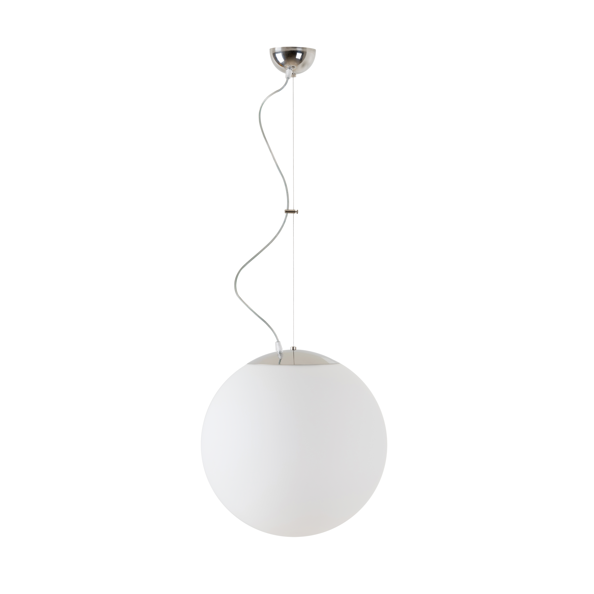 Nerez leštěné závěsné LED svítidlo DALI a skleněné stínidlo TRIPLEX OPAL. Lankový závěs (s přívodním kabelem) o délce 100 cm.